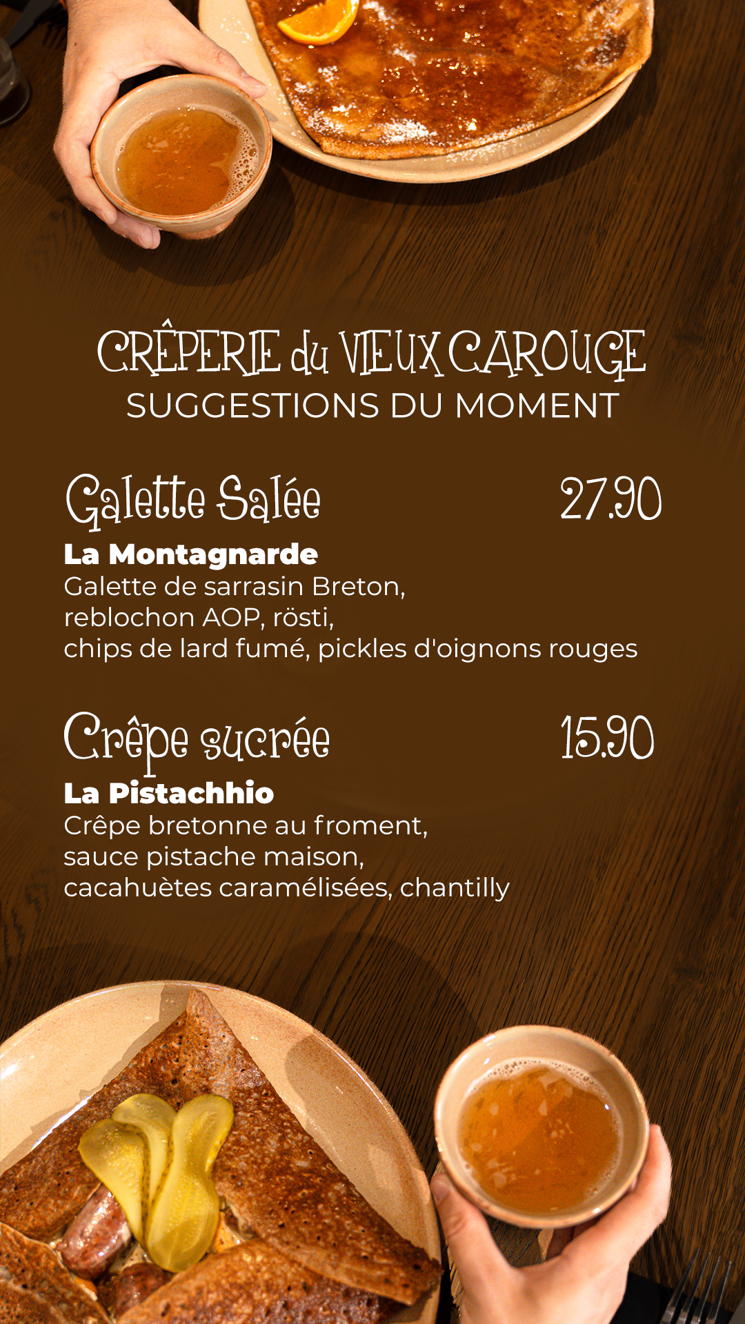 La crêperie du Vieux Carouge défend des valeurs de tradition, de terroir, de qualité et d’identité. Nous sommes transparents dans le choix de nos partenaires et producteurs.